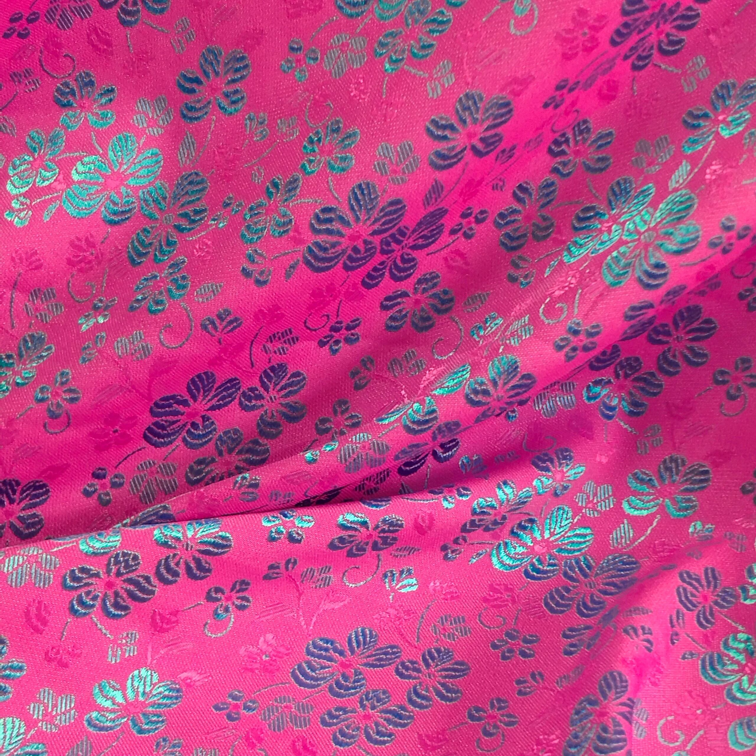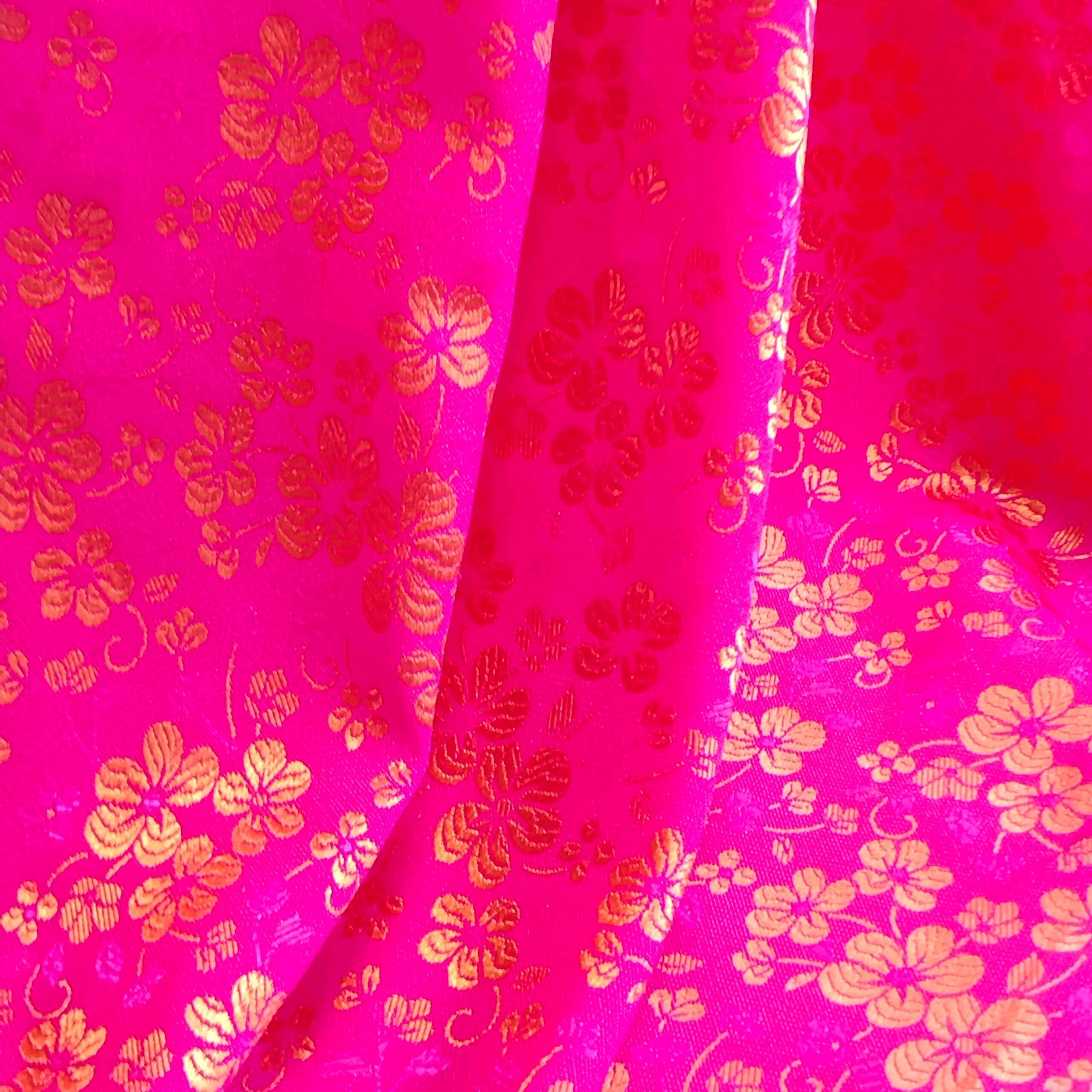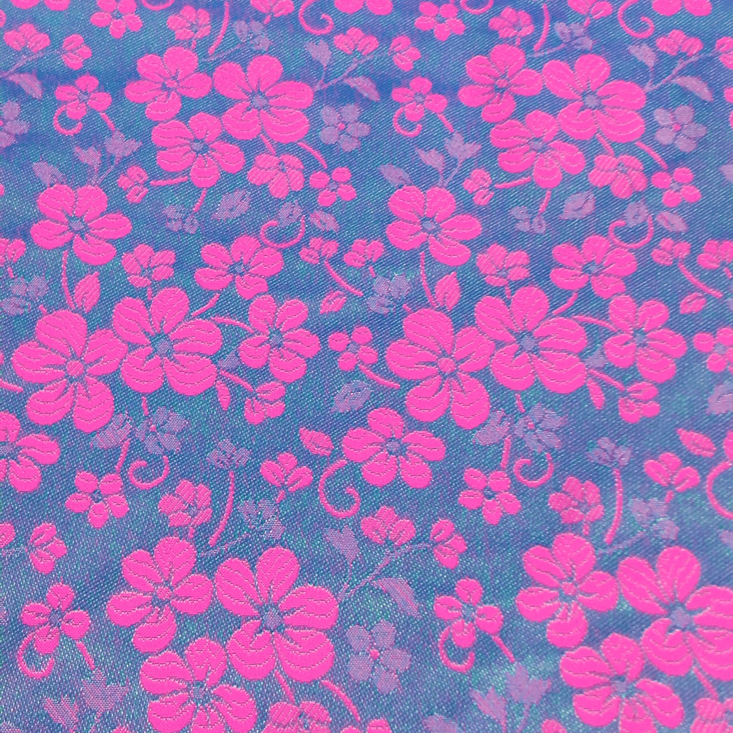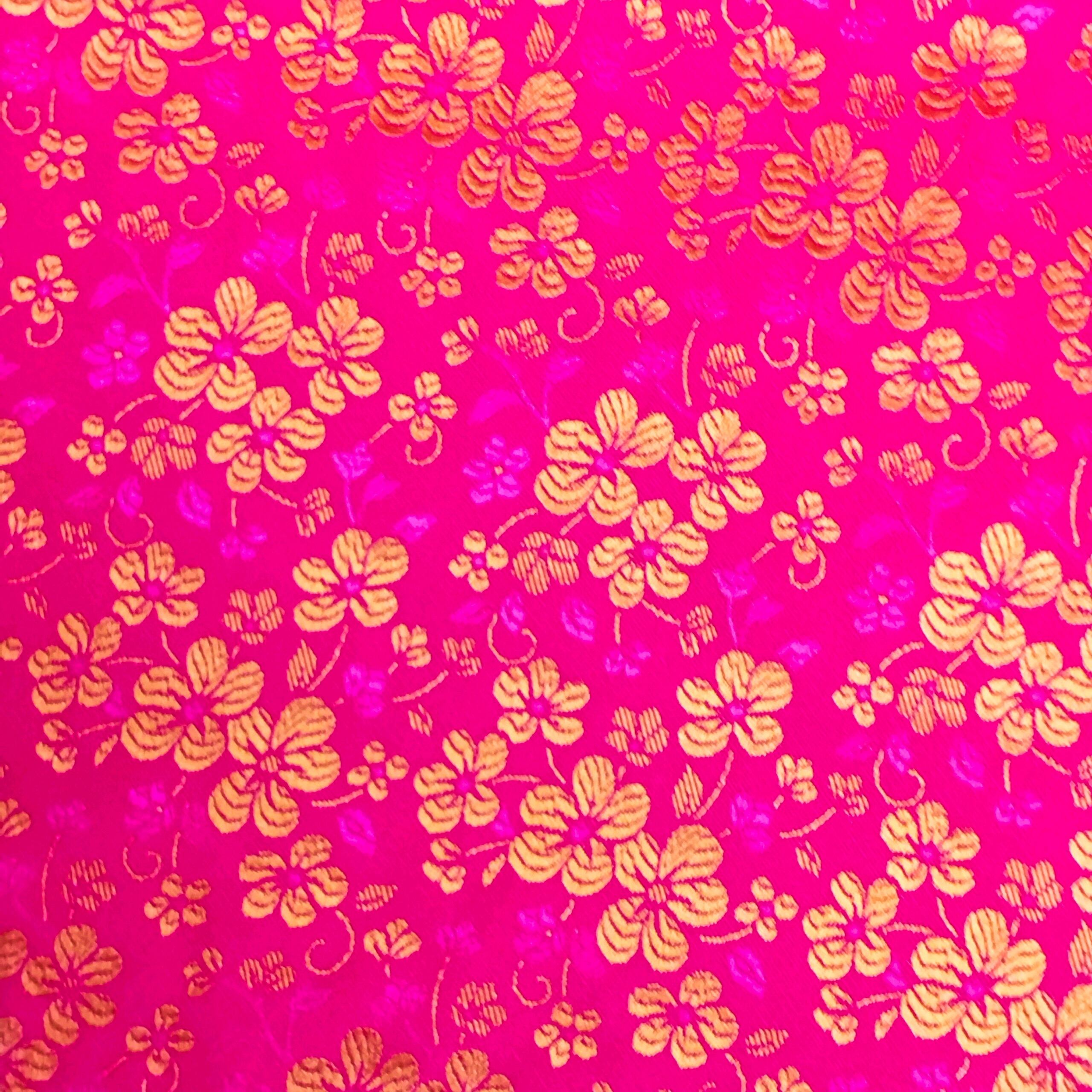 ショッキングピンクの地に華やかな小花が散りばめられており、